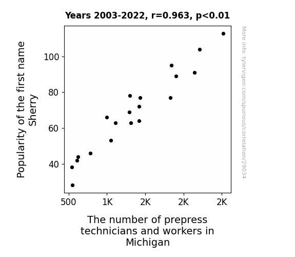 This means 92.7% of the change in the one variable (i.e., The number of prepress technicians and workers in Michigan) is predictable based on the change in the other (i.e., Popularity of the first name Sherry) over the 20 years from 2003 through 2022.