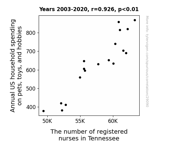 This means 85.8% of the change in the one variable (i.e., The number of registered nurses in Tennessee) is predictable based on the change in the other (i.e., Annual US household spending on pets, toys, and hobbies) over the 18 years from 2003 through 2020.