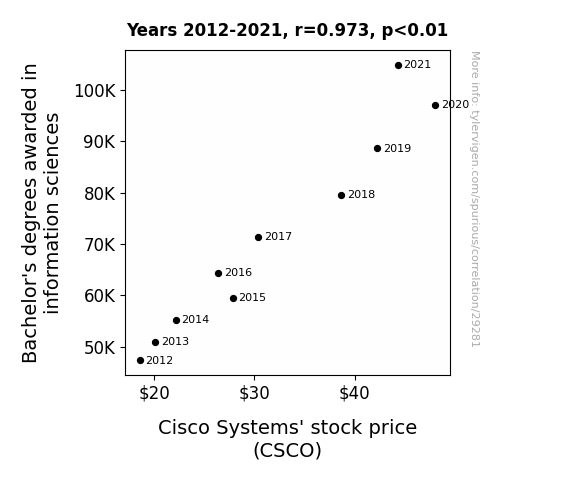 This means 94.7% of the change in the one variable (i.e., Cisco Systems' stock price (CSCO)) is predictable based on the change in the other (i.e., Bachelor's degrees awarded in information sciences) over the 10 years from 2012 through 2021.