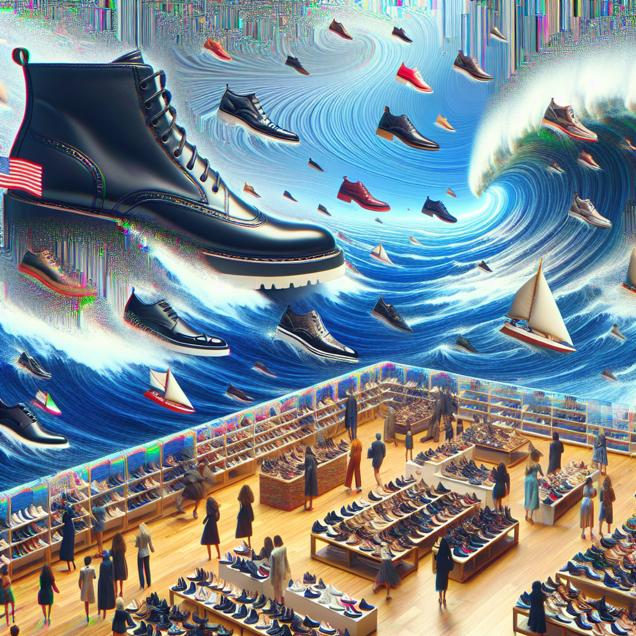 ChatGPT: A cluster of stylish Faroese shoes spinning in tiny tornadoes, being carried by the wind from the Faroe Islands to the US. Inside a shoe store in the US, customers eagerly trying on the newly arrived Nordic-style shoes, while sales figures on a board behind the counter show a sharp incline.