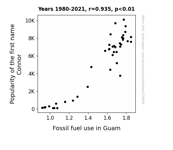 This means 87.4% of the change in the one variable (i.e., Fossil fuel use in Guam) is predictable based on the change in the other (i.e., Popularity of the first name Connor) over the 42 years from 1980 through 2021.