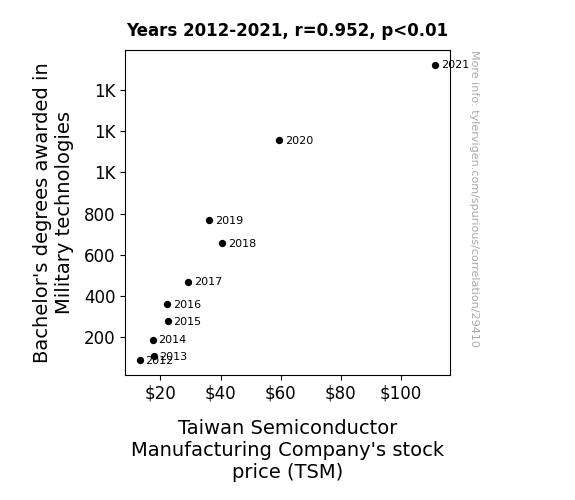 This means 90.6% of the change in the one variable (i.e., Taiwan Semiconductor Manufacturing Company's stock price (TSM)) is predictable based on the change in the other (i.e., Bachelor's degrees awarded in Military technologies) over the 10 years from 2012 through 2021.