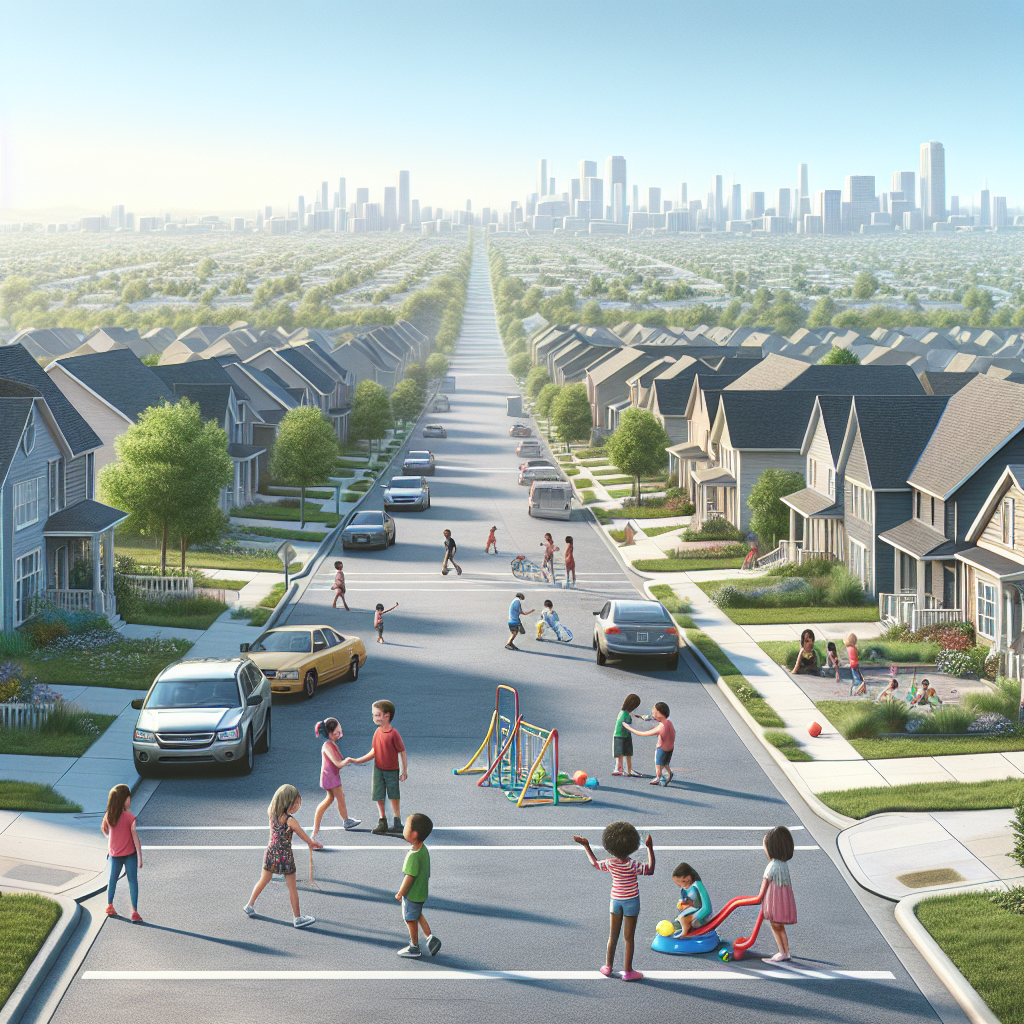 Prompt: Prompt: [ A photo-realistic image ] Generate an image of a quiet neighborhood in Provo, Utah. Fewer children are playing outside, and there are fewer cars lining the streets. The scene shows a gradual decrease in the number of Val drivers, resulting in cleaner skies above the city. The image should depict a serene and peaceful atmosphere with a sense of diminishing urban congestion. The depiction should include only scenes, people, and objects, it should not include text or speech bubbles.