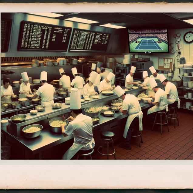 ChatGPT: Imagine a bustling kitchen in Alaska, where a group of chefs and head cooks are gathered, each meticulously crafting their own culinary masterpieces. Amidst the busy scene, a large screen in the corner of the kitchen proudly displays the number "31," symbolizing the impressive 31 Grand Slam Finals that Roger Federer has played. The chefs, inspired by Federer's elegance and precision on the tennis court, are fervently honing their own skills to create dishes as refined and skillful as Federer's legendary backhand.