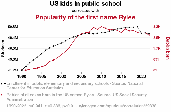 This means 88.6% of the change in the one variable (i.e., Popularity of the first name Rylee) is predictable based on the change in the other (i.e., US kids in public school) over the 33 years from 1990 through 2022.
