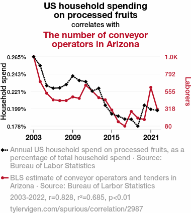 - The spurious research paper: The Peel Deal: Examining the Relationship Between US Household Spending on Processed Fruits and the Number of Conveyor Operators in Arizona