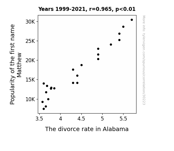 This means 93.2% of the change in the one variable (i.e., The divorce rate in Alabama) is predictable based on the change in the other (i.e., Popularity of the first name Matthew) over the 23 years from 1999 through 2021.