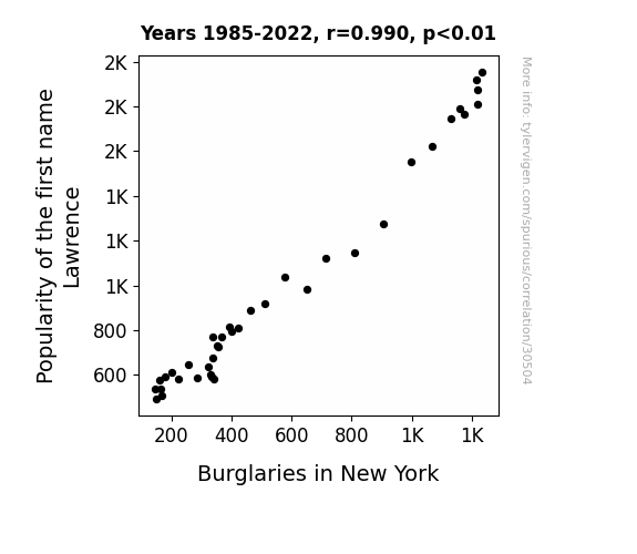 This means 97.9% of the change in the one variable (i.e., Burglaries in New York) is predictable based on the change in the other (i.e., Popularity of the first name Lawrence) over the 38 years from 1985 through 2022.