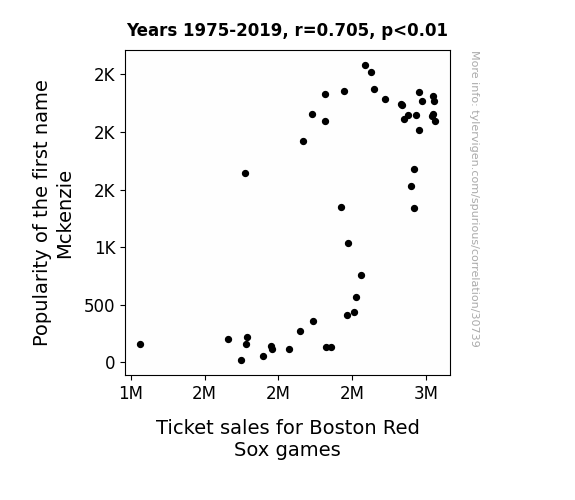 This means 49.6% of the change in the one variable (i.e., Ticket sales for Boston Red Sox games) is predictable based on the change in the other (i.e., Popularity of the first name Mckenzie) over the 45 years from 1975 through 2019.