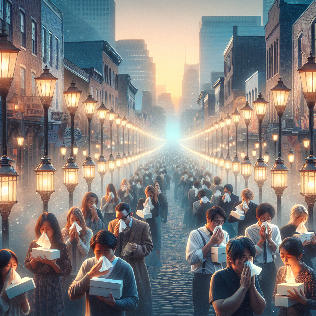 Prompt: [Concept art] Create an image of a bustling Nashville street at night, with a layer of haze blanketing the city. In the foreground, depict a group of people sneezing and clutching tissue boxes. In the background, show a procession of kerosene lamps leading the way through the city, with a subtle nod to Japanese cultural elements. The scene should balance the hazy, whimsical atmosphere with the practicality of providing light for the sneezing citizens. The depiction should include only scenes, people, and objects, it should not include text or speech bubbles.