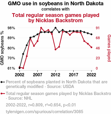 A linear line chart with years as the X-axis and two variables on the Y-axis. The first variable is GMO use in soybeans in North Dakota and the second variable is Total regular season games played by Nicklas Backstrom.  The chart goes from 2002 to 2022, and the two variables track closely in value over that time. Small Image