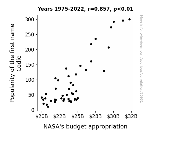 This means 73.4% of the change in the one variable (i.e., NASA's budget appropriation) is predictable based on the change in the other (i.e., Popularity of the first name Codie) over the 48 years from 1975 through 2022.