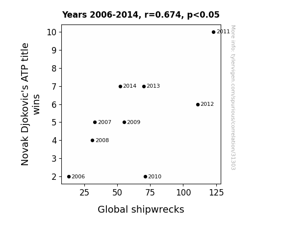 This means 45.4% of the change in the one variable (i.e., Global shipwrecks ) is predictable based on the change in the other (i.e., Novak Djokovic's ATP title wins) over the 9 years from 2006 through 2014.