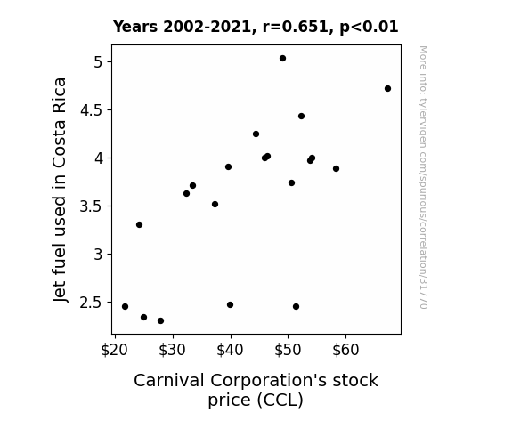 This means 42.4% of the change in the one variable (i.e., Carnival Corporation's stock price (CCL)) is predictable based on the change in the other (i.e., Jet fuel used in Costa Rica) over the 20 years from 2002 through 2021.