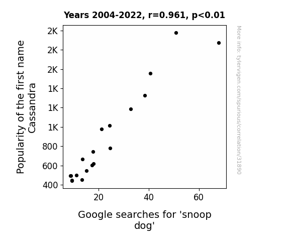 This means 92.3% of the change in the one variable (i.e., Google searches for 'snoop dog') is predictable based on the change in the other (i.e., Popularity of the first name Cassandra) over the 19 years from 2004 through 2022.