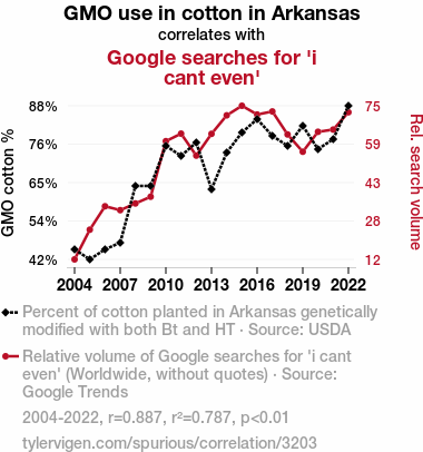 - The spurious research paper: The GMO Conundrum: A Spun Yarn Connecting Genetically Modified Cotton in Arkansas to 'I Can't Even' Google Searches