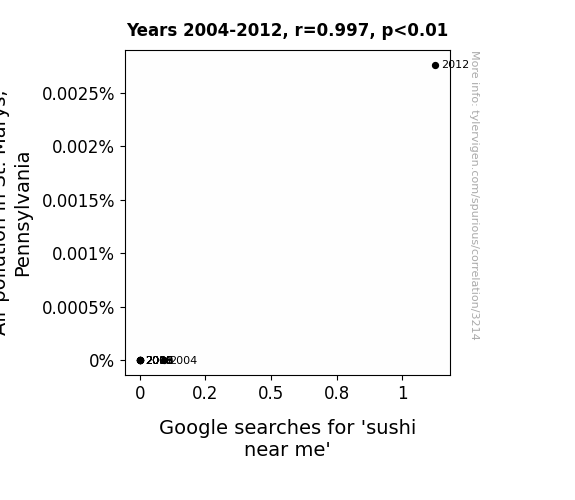 This means 99.3% of the change in the one variable (i.e., Google searches for 'sushi near me') is predictable based on the change in the other (i.e., Air pollution in St. Marys, Pennsylvania) over the 9 years from 2004 through 2012.