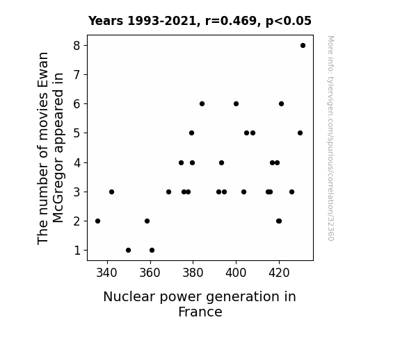 This means 22% of the change in the one variable (i.e., Nuclear power generation in France) is predictable based on the change in the other (i.e., The number of movies Ewan McGregor appeared in) over the 29 years from 1993 through 2021.