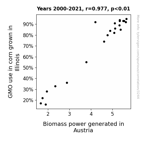 This means 95.4% of the change in the one variable (i.e., Biomass power generated in Austria) is predictable based on the change in the other (i.e., GMO use in corn grown in Illinois) over the 22 years from 2000 through 2021.