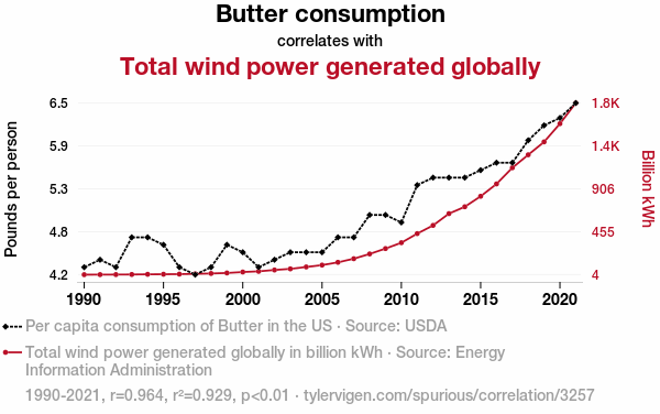 This means 92.9% of the change in the one variable (i.e., Total wind power generated globally) is predictable based on the change in the other (i.e., Butter consumption) over the 32 years from 1990 through 2021.