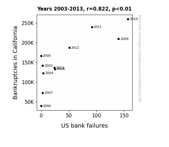 This means 67.6% of the change in the one variable (i.e., US bank failures) is predictable based on the change in the other (i.e., Bankruptcies in California) over the 11 years from 2003 through 2013.