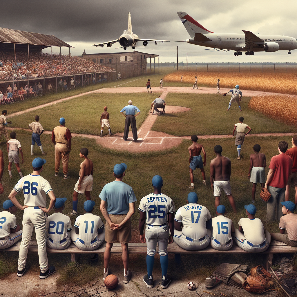 Prompt: [ A scene from Skyrim ] A group of baseball players stand on the sidelines of a deserted and overgrown baseball field in Louisiana, eagerly awaiting a game that never happens. In the background, the empty soccer pitch adds to the sense of quiet abandonment. Meanwhile, a line of powerful jets sits on the tarmac in Estonia, their engines roaring as they wait to take off, symbolizing the chaos in the air caused by the shortage of referees in Louisiana. The scene is dynamic and filled with anticipation, depicting the impact of the scarcity of officials on sports events in an evocative and visually striking way. The depiction should include only scenes, people, and objects, it should not include text or speech bubbles.