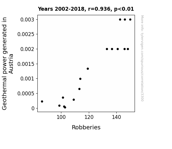 User prompt: Please provide potential search keywords for a paper titled Hot Spots and Hot Heists: Unearthing the Geothermal-Robbery Connection in Austria with an abstract of This paper investigates the intriguing relationship between geothermal power generation in Austria and incidences of robberies, presenting a correlation analysis from 2002 to 2018. Leveraging data from the Energy Information Administration and the FBI Criminal Justice Information Services, our findings reveal a robust correlation coefficient of 0.9358536 with statistical significance (p < 0.01), suggesting a compelling link between these seemingly disparate phenomena.