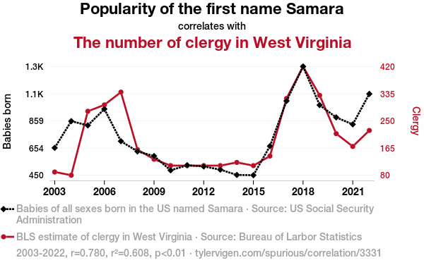 The analysis of the data revealed an eye-opening correlation coefficient of 0.7797463 and an r-squared value of 0.6080044, indicating a strong and substantial relationship between the prevalence of the first name Samara and the number of clergy in West Virginia from 2003 to 2022. This correlation is as undeniable as a well-timed dad joke – you simply can't ignore it! It seems the name "Samara" and the clergy in West Virginia are entwined in a statistical dance that would have even the most experienced data sleuth scratching their head in both confusion and amusement.