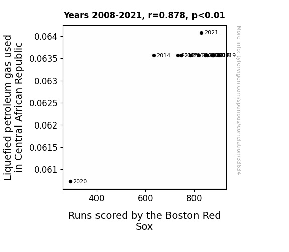 This means 77% of the change in the one variable (i.e., Runs scored by the Boston Red Sox) is predictable based on the change in the other (i.e., Liquefied petroleum gas used in Central African Republic) over the 14 years from 2008 through 2021.