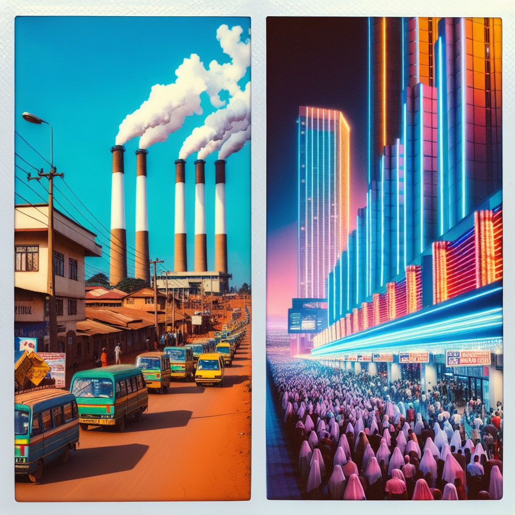 ChatGPT: Generate a Polaroid photo capturing the stark contrast between the bustling streets of Kampala, Uganda, and the vibrant energy of its Biomass power plant, with tall smokestacks billowing white clouds into the clear blue sky. In the background, juxtapose the scene with an influx of tourists lining up outside a row of towering hotels in the neon-lit desert night of Las Vegas. The photo should convey the connection between the renewable energy buzz in Uganda and the surge in hotel check-ins in Las Vegas.