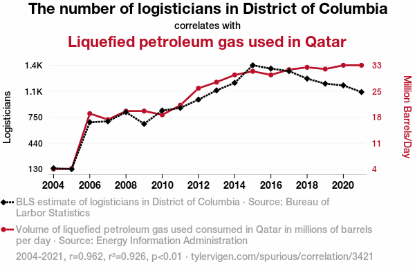Logisticians, District of Columbia, liquefied petroleum gas, LPG, Qatar, correlation, Bureau of Labor Statistics, Energy Information Administration, statistical analysis, relationship, causation, investigation, logistics, energy, intersections