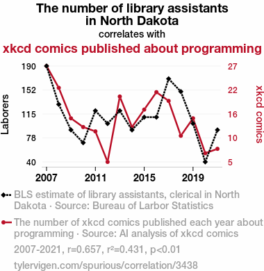 - The spurious research paper: Checking Out the Relationship Between Library Assistants in North Dakota and xkcd Comics on Programming: A Statistical Analysis