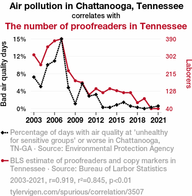 Air pollution, proofreaders, Tennessee, Chattanooga, correlation, statistical relationship, environmental protection agency data, bureau of labor statistics, smog, typo vigilantes, wordplay