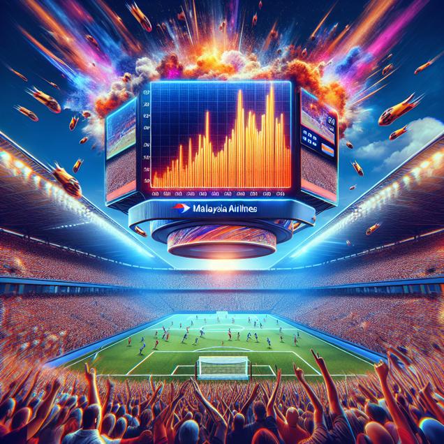 ChatGPT: Title: Super Bowl Shockwave Generate an image showing a dynamic scene of a football stadium with a larger-than-life scoreboard, displaying the widening point difference between the two teams. Beneath the scoreboard, visualize a bar chart representing the surge in Google searches for "Malaysia Airlines" following the game's progression. The bar chart should sharply ascend, indicating the synchronized increase in online searches. The overall image should have a lively and vivid energy, capturing the intensity of the Super Bowl and its impact on digital activity.