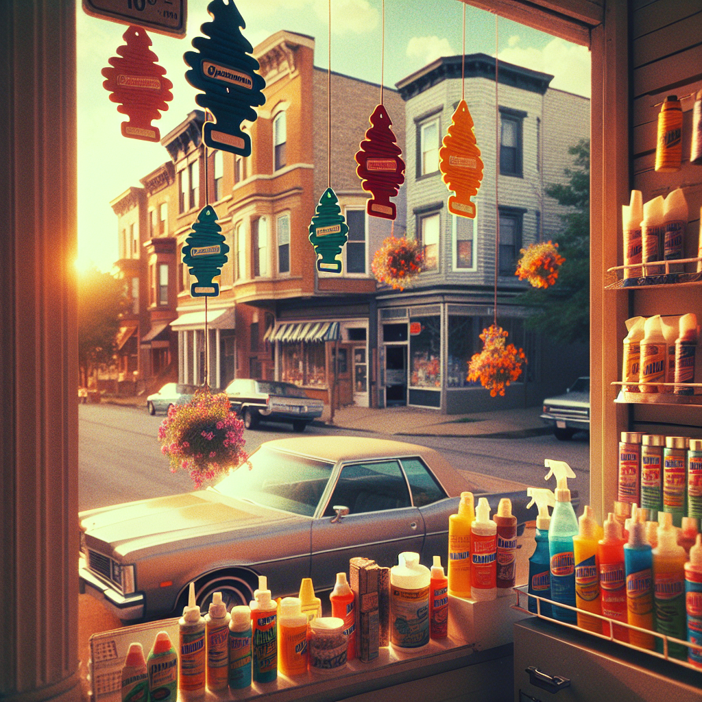Prompt: Create an image with the style of a vintage Polaroid photo that captures a serene Cincinnati neighborhood scene. Colorful, freshly scented air fresheners hang from the open windows, casting a warm and inviting glow. The stocked shelves of a nearby store filled with housekeeping supplies are visible in the background, subtly hinting at increased household spending. The soft, golden light streaming through the open windows accentuates the improved air circulation, contributing to the overall enhanced air quality in the city. The depiction should include only scenes, people, and objects, it should not include text or speech bubbles.