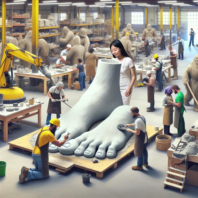 Prompt: Prompt: Generate an image of Sadie, a fiberglass laminator in the Arkansas warehouse, carefully sculpting a larger-than-life Sasquatch footprint. The warehouse is bustling with activity as other workers use drills and saws to add intricate details to the footprints. Show the name "Sadie" on the name tags of multiple workers, indicating the name's popularity among the team. The scene should convey both the industrious nature of the workers and the growing demand for Sasquatch-themed attractions. The depiction should include only scenes, people, and objects, it should not include text or speech bubbles.