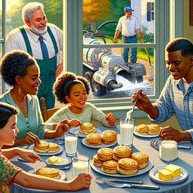 Prompt: Prompt: Generate an image of a cozy kitchen in Virginia, where a family is gathered around the breakfast table, enjoying freshly-baked biscuits slathered in rich, creamy butter. As they savor the meal, a buttery fingerprint is left on the glass of milk and a slippery buttered knife falls into the kitchen sink. Outside the kitchen window, a septic tank servicer and sewer pipe cleaner are working diligently, clearing clogs caused by dropped buttery items. Capture the warmth of the kitchen scene and the bustling outdoor work in a simple yet detailed visual depiction reflecting the style of a Discovery magazine cover. The depiction should include only scenes, people, and objects, it should not include text or speech bubbles.
