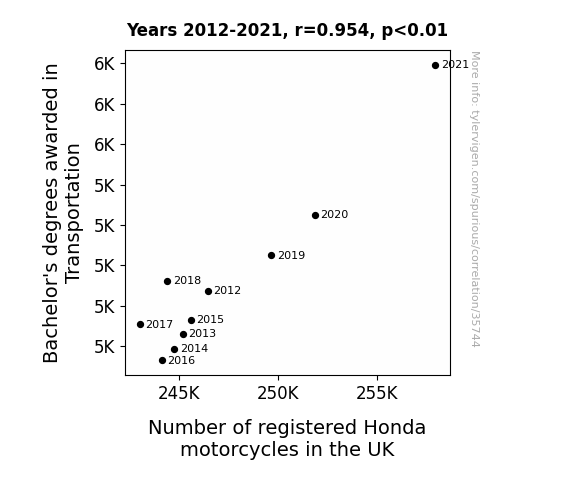 This means 90.9% of the change in the one variable (i.e., Number of registered Honda motorcycles in the UK) is predictable based on the change in the other (i.e., Bachelor's degrees awarded in Transportation) over the 10 years from 2012 through 2021.