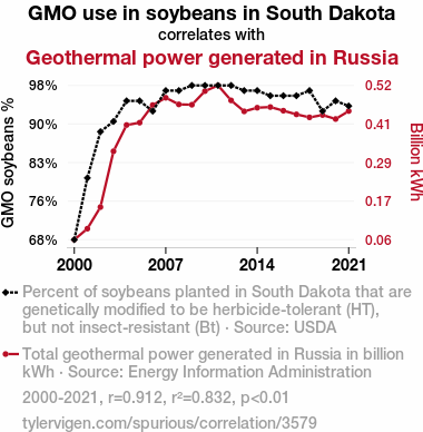 User prompt: Please make up a funny explanation for how an increase in GMO use in soybeans in South Dakota caused Geothermal power generated in Russia to increase.