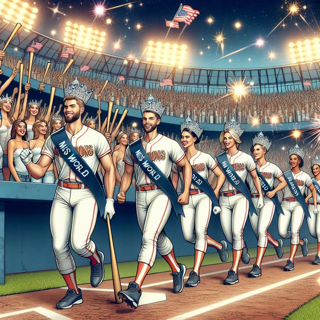 Prompt: Generate an image of a bustling stadium filled with enthusiastic fans, with the Cleveland Guardians players proudly taking the field adorned in sashes and crowns characteristic of Miss World pageant contestants. The number of Miss World delegates should be noticeably fewer, yet the team exudes unwavering confidence. Capture the scene as the Guardians revel in another triumph on the field, evoking an air of jubilation and celebration. The overall visual should be vibrant, dynamic, and celebratory, resembling the cover of a Discovery magazine that captivates the audience's attention. The depiction should include only scenes, people, and objects, it should not include text or speech bubbles.