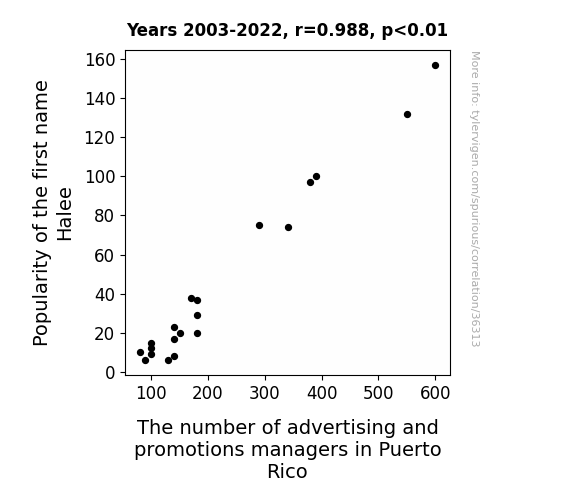 This means 97.5% of the change in the one variable (i.e., The number of advertising and promotions managers in Puerto Rico) is predictable based on the change in the other (i.e., Popularity of the first name Halee) over the 20 years from 2003 through 2022.