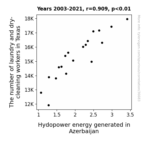 This means 82.6% of the change in the one variable (i.e., Hydopower energy generated in Azerbaijan) is predictable based on the change in the other (i.e., The number of laundry and dry-cleaning workers in Texas) over the 19 years from 2003 through 2021.