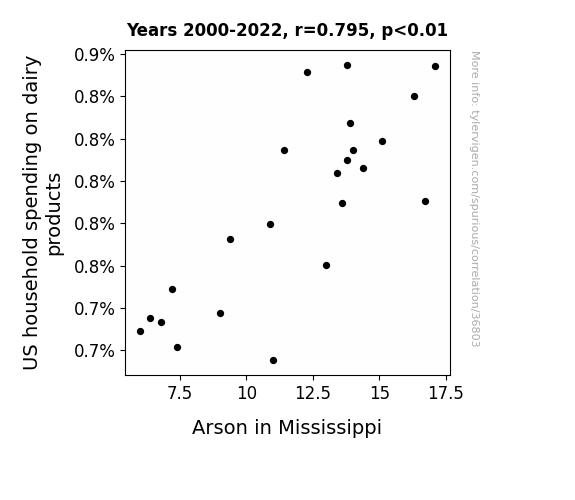 This means 63.2% of the change in the one variable (i.e., Arson in Mississippi) is predictable based on the change in the other (i.e., US household spending on dairy products) over the 23 years from 2000 through 2022.