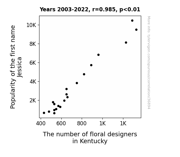 This means 97% of the change in the one variable (i.e., The number of floral designers in Kentucky) is predictable based on the change in the other (i.e., Popularity of the first name Jessica) over the 20 years from 2003 through 2022.
