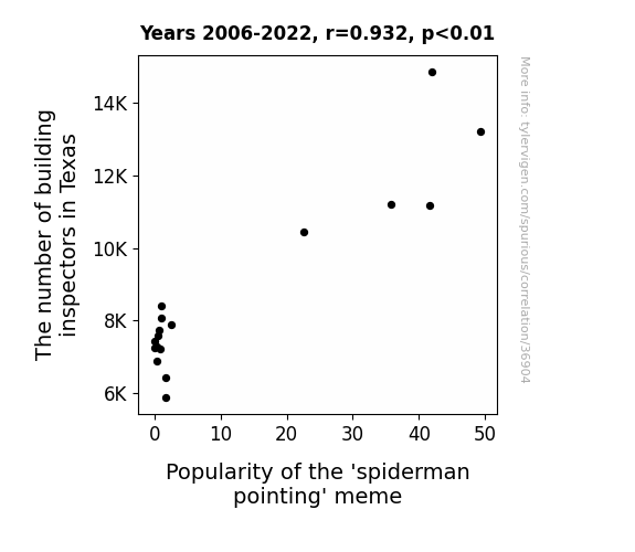 This means 86.9% of the change in the one variable (i.e., Popularity of the 'spiderman pointing' meme) is predictable based on the change in the other (i.e., The number of building inspectors in Texas) over the 17 years from 2006 through 2022.
