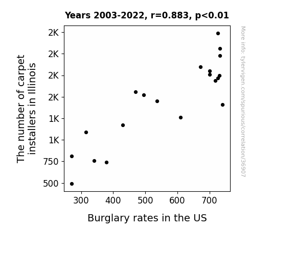 This means 77.9% of the change in the one variable (i.e., Burglary rates in the US) is predictable based on the change in the other (i.e., The number of carpet installers in Illinois) over the 20 years from 2003 through 2022.