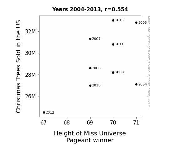 This means 30.7% of the change in the one variable (i.e., Height of Miss Universe Pageant winner) is predictable based on the change in the other (i.e., Christmas Trees Sold in the US) over the 10 years from 2004 through 2013.