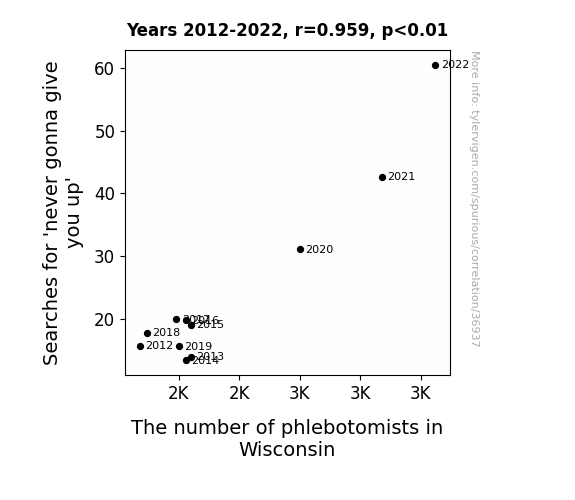 This means 92.1% of the change in the one variable (i.e., The number of phlebotomists in Wisconsin) is predictable based on the change in the other (i.e., Searches for 'never gonna give you up') over the 11 years from 2012 through 2022.