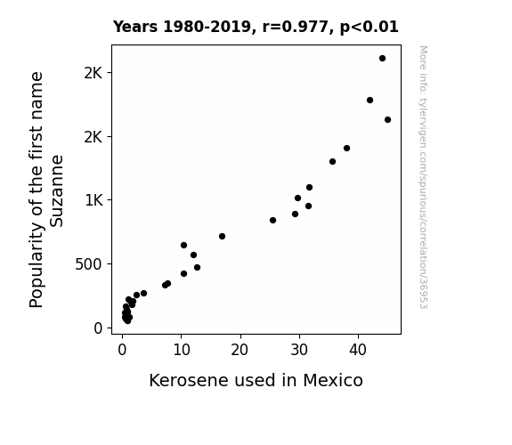 This means 95.4% of the change in the one variable (i.e., Kerosene used in Mexico) is predictable based on the change in the other (i.e., Popularity of the first name Suzanne) over the 40 years from 1980 through 2019.