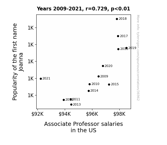 This means 53.1% of the change in the one variable (i.e., Associate Professor salaries in the US) is predictable based on the change in the other (i.e., Popularity of the first name Joanna) over the 13 years from 2009 through 2021.